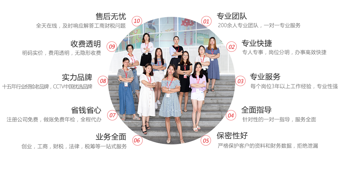 我司兩百余名專(zhuān)業(yè)顧問(wèn)團(tuán)隊(duì),積累多年豐富的行業(yè)經(jīng)驗(yàn),精通熟悉政府操作流程,根據(jù)不同行業(yè)客戶(hù)需求,提供專(zhuān)業(yè),全方位的工商注冊(cè)、財(cái)稅代理建議,認(rèn)真對(duì)待每一項(xiàng)業(yè)務(wù),讓您真正的省錢(qián)、省心,做到時(shí)時(shí)跟進(jìn),完全讓您放心!老品牌值得信賴(lài)!